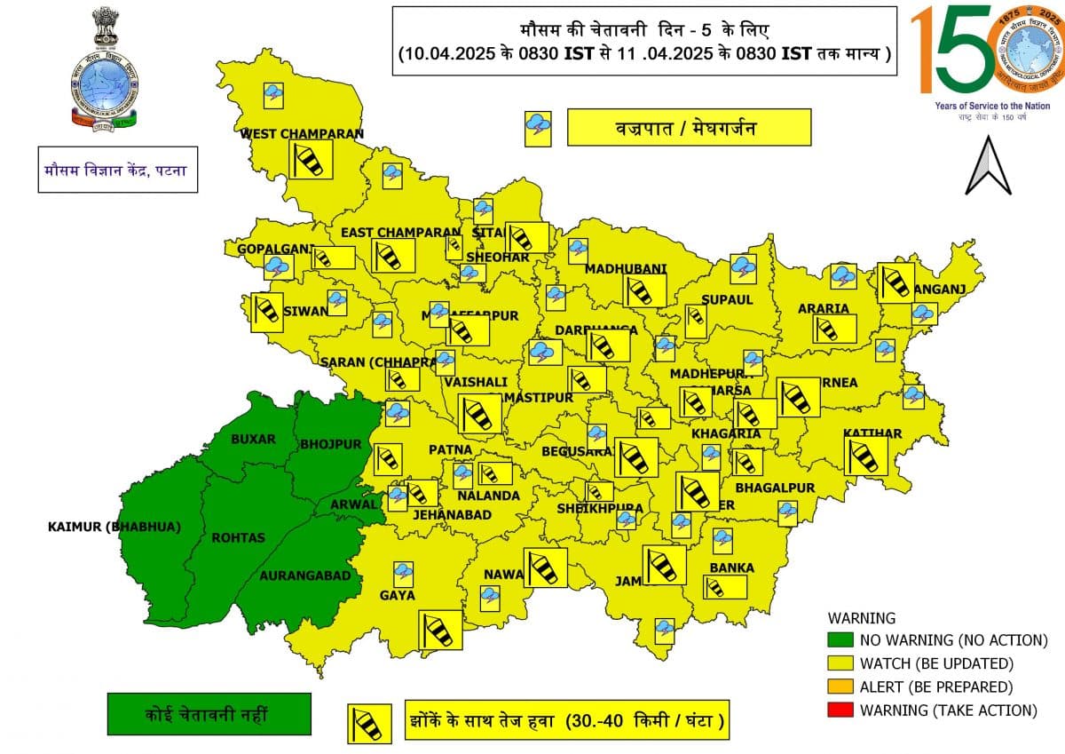 पटना मौसम विज्ञान केंद्र ने बिहार के पटना, गया, भागलपुर, मुजफ्फरपुर, दरभंगा, औरंगाबाद, बेगूसराय, जहानाबाद, नवादा, नालंदा, मुंगेर, सारण, वैशाली, गोपालगंज, सीतामढ़ी, पूर्वी चंपारण, पश्चिम चंपारण, मधुबनी, अररिया, पूर्णिया, किशनगंज, कटिहार, सहरसा, सुपौल, खगड़िया, लखीसराय, जमुई, शेखपुरा, समस्तीपुर, शिवहर, बांका, और मधेपुरा जिले में 10 और 11 अप्रैल को भयंकर बारिश होने की संभावना जताई है. इस दौरान इन जिलों में 30- 40 किमी प्रतिघंटे की स्पीड से हवा भी चलने का पूर्वानुमान है.