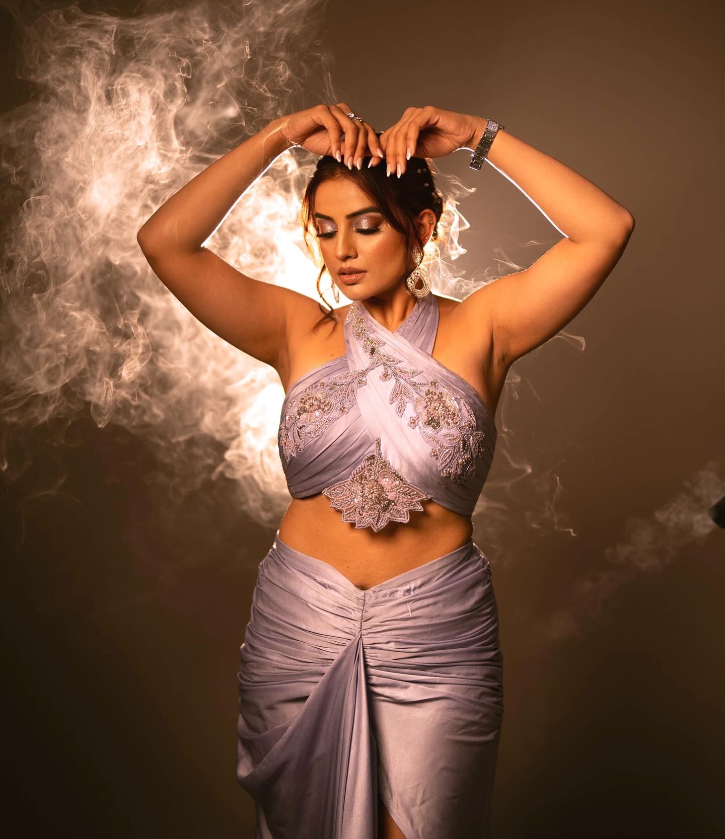 लेटेस्ट फोटोज में अक्षरा ने पर्पल कलर की थाई-हाई स्लिट ड्रेस पहनी है. जिसमें वह किलर पोज दे रही हैं.
