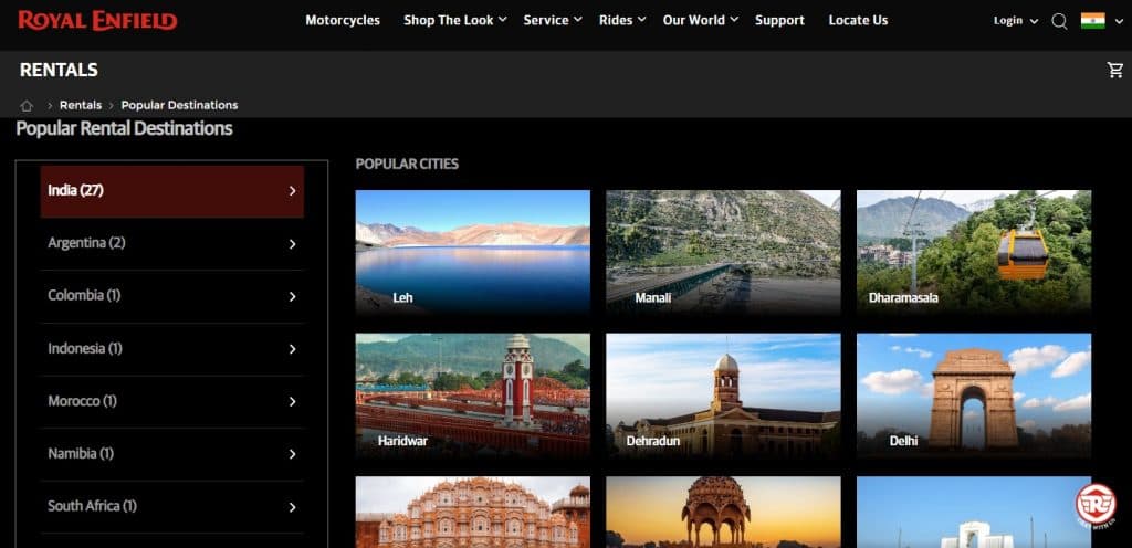 कंपनी की वेबसाइट में दी गई जानकारी के अनुसार, ‘रॉयल एनफील्ड रेंटल’ के तहत आप भारत के कम से कम 27 शहरों की सैर कर सकते हैं. इन शहरों में लेह, मनाली, धर्मशाला, हरिद्वार, देहरादून, दिल्ली, जयपुर, जैसलमेर, चेन्नई, नैनीताल, अहमदाबाद, गोवा, सिलीगुड़ी, भुवनेश्वर, बीर बिलिंग, उदयपुर, हल्द्वानी, हैदराबाद, शिमला, मुंबई, तिरुअनंतपुरम, बेंगलुरु, कोचिन, चंडीगढ़, भुंटार, विशाखापट्टनम और ऋषिकेश शामिल हैं.