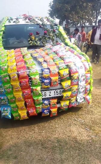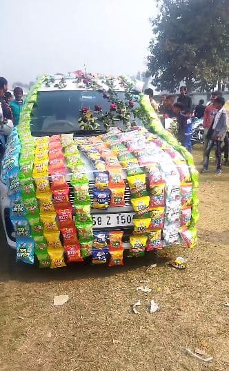 बंदे ने दूल्हे की कार को बना दिया चिप्स-कुरकुरे की दुकान. फोटो: प्रभात खबर