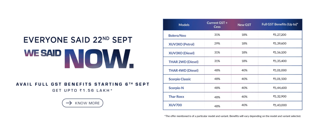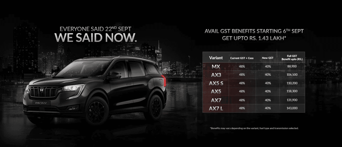 GST स्लैब में हुए बदलाव 22 सितंबर से लागू होने वाले हैं. जिसके तहत बड़ी SUV गाड़ियों के दाम घट रहे हैं. ऐसे में महिंद्रा ने सबसे पहले अपनी गाड़ियों की कीमत में कटौती की है. जिससे ग्राहकों को काफी फायदा होगा. ऐसे में अगर आप भी महिंद्रा की गाड़ियां खरीदना चाहते हैं, तो आपके पास खरीदने का सही मौका है.