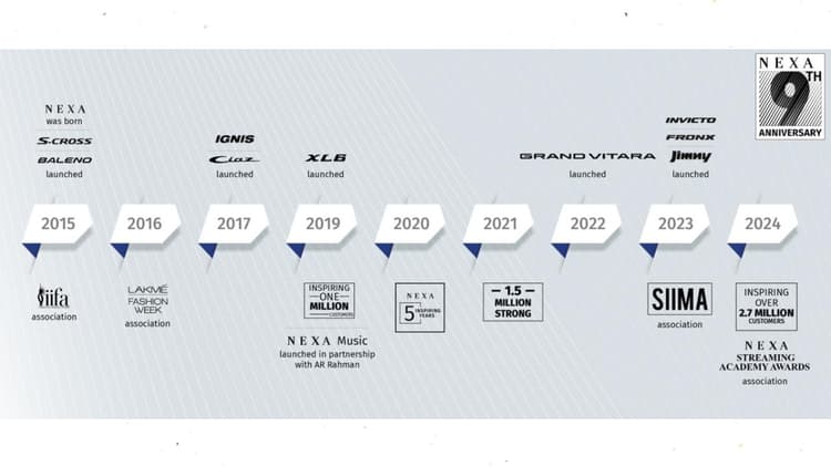 नेक्सा की वृद्धि और सफलता की इस लंबी अवधि के दौरान मारुति सुजुकी इंडिया लिमिटेड के मार्केटिंग और बिक्री के वरिष्ठ कार्यकारी अधिकारी पार्थो बनर्जी ने कहा कि नेक्सा के प्रत्येक मॉडल को ऐसे उपभोक्ताओं की जीवनशैली को ध्यान में रखकर डिजाईन किया गया है जो विश्वसनीयता के साथ उन्नत सुविधाओं और प्रौद्योगिकी के मिश्रण की तलाश करते है.उन्होंने कहा, “ग्रैंड विटारा, फ्रोंक्स, जिम्नी और इनविक्टो जैसे मॉडलों के जुड़ने से हमारा लाइनअप और समृद्ध हुआ है जिससे ग्राहकों को अधिक विकल्प मिले है.जो पैसे के लिए अविश्वसनीय मूल्य प्रदान करते है.