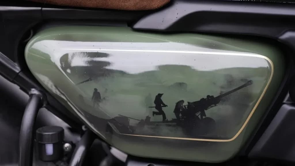 बाईं ओर के कवर में एक गोलाकार लैंप जोड़ा गया है जिस पर 99 लिखा हुआ है.यह हल्के पीले रंग में जलता है.सीट और हैंडल ग्रिप साबर चमड़े से ढके हुए है. पेंट का काम अनोखा है क्योंकि टैंक के शीर्ष को स्टील से बने कवच के रूप में चित्रित किया गया है.जिसके शीर्ष पर कारगिल दिवस का लोगो है.घुटने के पीछे के हिस्से को जैतून के हरे रंग में रंगा गया है.जिसमें कारगिल युद्ध की तस्वीरें लगी हुई है.साइड कवर में युद्ध की तस्वीरें भी लगी हुई है.टैंक के किनारे पर तिरंगा भी है जो हेडलैंप यूनिट तक जाता है.
