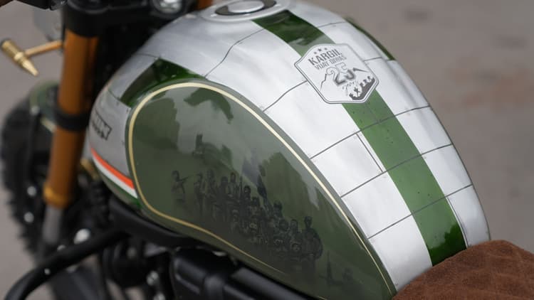 बाईं ओर के कवर में एक गोलाकार लैंप जोड़ा गया है जिस पर 99 लिखा हुआ है.यह हल्के पीले रंग में जलता है.सीट और हैंडल ग्रिप साबर चमड़े से ढके हुए है. पेंट का काम अनोखा है क्योंकि टैंक के शीर्ष को स्टील से बने कवच के रूप में चित्रित किया गया है.जिसके शीर्ष पर कारगिल दिवस का लोगो है.घुटने के पीछे के हिस्से को जैतून के हरे रंग में रंगा गया है.जिसमें कारगिल युद्ध की तस्वीरें लगी हुई है.साइड कवर में युद्ध की तस्वीरें भी लगी हुई है.टैंक के किनारे पर तिरंगा भी है जो हेडलैंप यूनिट तक जाता है.