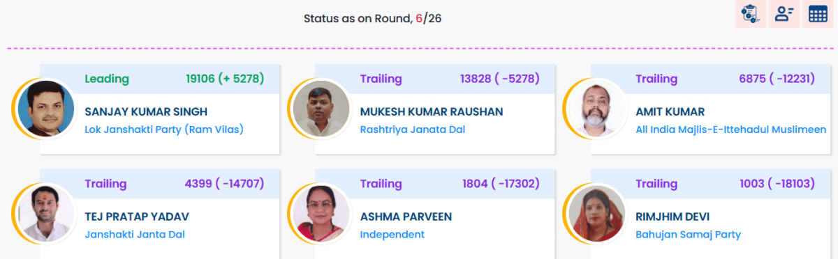 दूसरी ओर, महुआ सीट पर तेज प्रताप यादव के लिए स्थिति मुश्किल दिख रही है. छह राउंड की गिनती के बाद वे चौथे स्थान पर चल रहे हैं. इस सीट पर एलजेपी (रामविलास) के संजय कुमार सिंह 19,106 वोटों के साथ आगे हैं, जबकि दूसरे नंबर पर आरजेडी के मौजूदा विधायक मुकेश रोशन (13,828 वोट) हैं. तीसरे स्थान पर एआईएमआईएम के अमित कुमार हैं, जिन्हें 6,875 वोट मिले हैं.