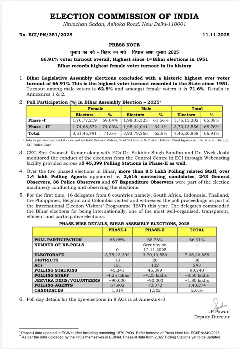 Bihar Election Voting Percentage: बिहार विधानसभा चुनाव 2025 के दोनों फेज में बिहार की जनता ने बढ़-चढ़कर हिस्सा लिया और इसका नतीजा यह निकला कि 73 साल के इतिहास में पहली बार 66.91% मतदान हुआ. पुरूष, महिला, युवा और यहां तक कि बुजुर्गों ने भी पूरा जोश दिखाया.