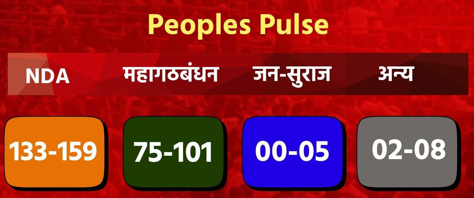 Bihar Exit Poll LIVE: एनडीटीवी के एग्जिट पोल पीपुल्स पल्स में भी भाजपा-जदयू के गठबंधन एनडीए को बहुमत दिया है. महागठबंधन को 75 से 101 सीटें मिलने का अनुमान व्यक्त किया गया है. पीके की पार्टी जन सुराज को 0 से 5 सीटें और अन्य को 2 से 8 सीटें मिलने की संभावना है.