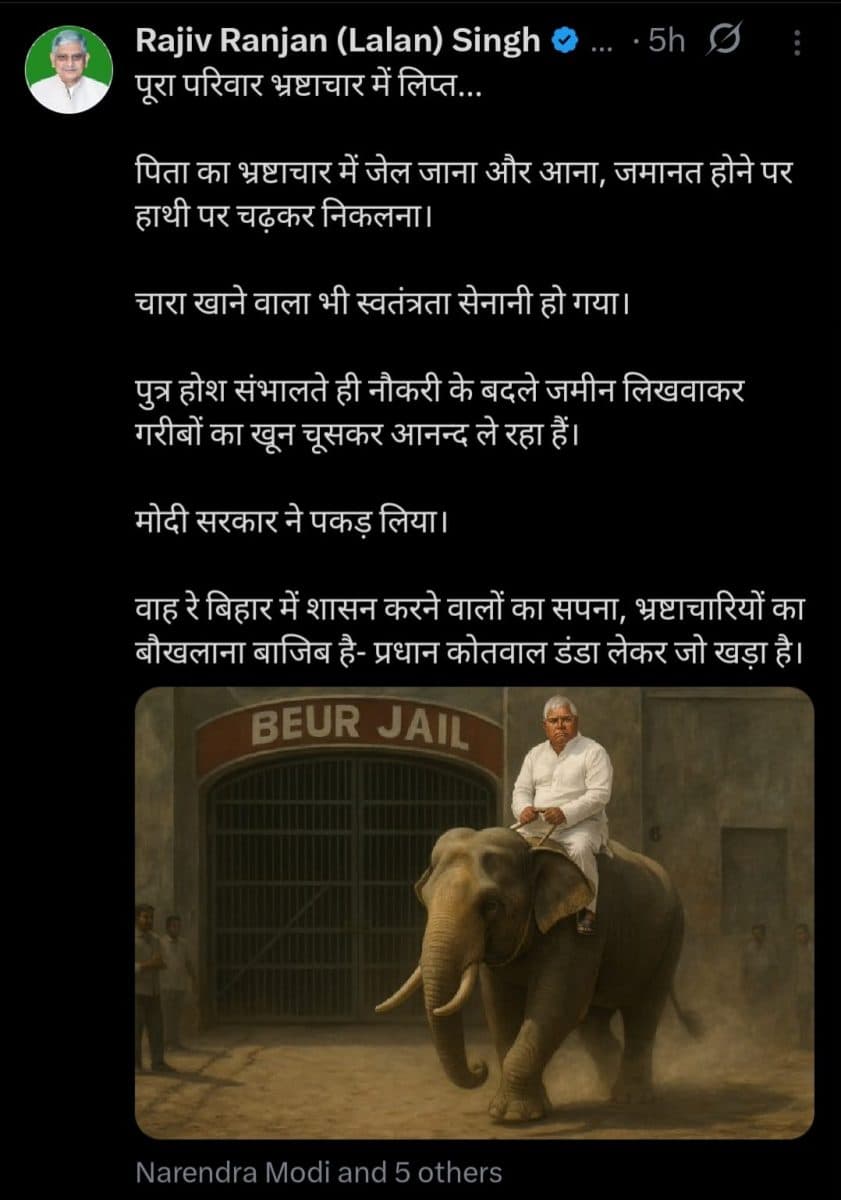 ललन सिंह ने सोशल मीडिया प्लेटफॉर्म एक्स पर लिखा- “पूरा परिवार भ्रष्टाचार में लिप्त है. पिता जेल जाते हैं, बेल पर छूटकर हाथी पर सवार होकर निकलते हैं. चारा खाने वाले भी खुद को स्वतंत्रता सेनानी बताते हैं. बेटा होश संभालते ही नौकरी के बदले जमीन लिखवाकर गरीबों का खून चूसने लगा. मोदी सरकार ने इन्हें पकड़ लिया. भ्रष्टाचारी नेताओं का बौखलाना लाजिमी है, क्योंकि प्रधान कोतवाल डंडा लेकर खड़ा है.”