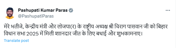 Bihar Politics: बिहार चुनाव में एनडीए की बड़ी जीत हुई. केंद्रीय मंत्री चिराग पासवान की पार्टी लोजपा (रामविलास) ने 19 सीटों पर कब्जा किया. इस बीच पूर्व केंद्रीय मंत्री पशुपति पारस ने चिराग पासवान को जीत की बधाई दी. पशुपति पारस ने बिहार चुनाव में चिराग पासवान की जीत को शानदार बताया. इस पोस्ट के वायरल होते ही बिहार की सियासत में हलचल पैदा हो गई है.