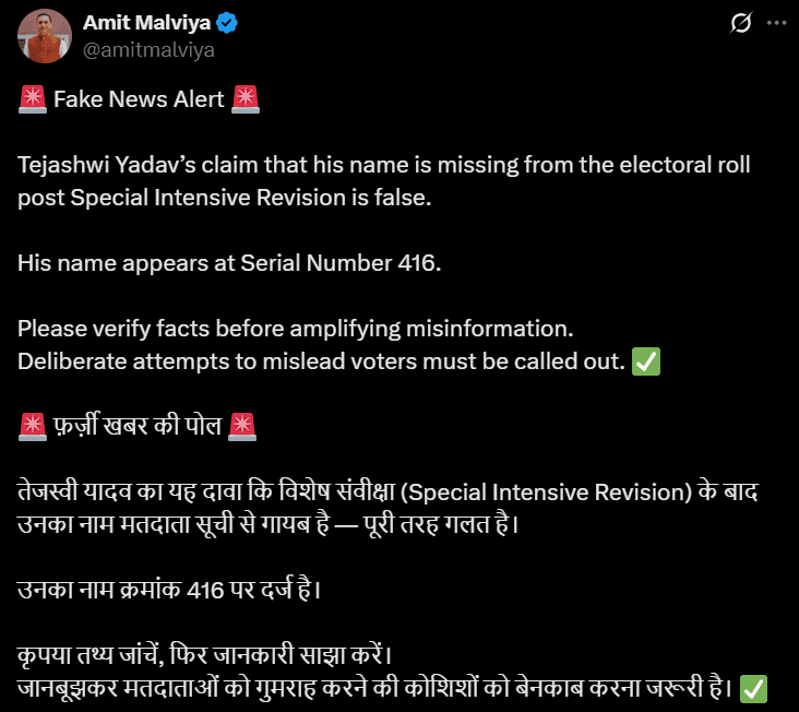 अमित मालवीय ने सोशल मीडिया प्लेटफॉर्म ‘एक्स’ पर एक पोस्ट में लिखा, “फर्जी खबर की खुली पोल. तेजस्वी यादव का यह दावा कि विशेष संवीक्षा (विशेष गहन पुनरीक्षण) के बाद उनका नाम मतदाता सूची से गायब है- पूरी तरह गलत है. उनका नाम क्रमांक 416 पर दर्ज है. कृपया तथ्य जांचें, फिर जानकारी साझा करें. जानबूझकर मतदाताओं को गुमराह करने की कोशिशों को बेनकाब करना जरूरी है.”