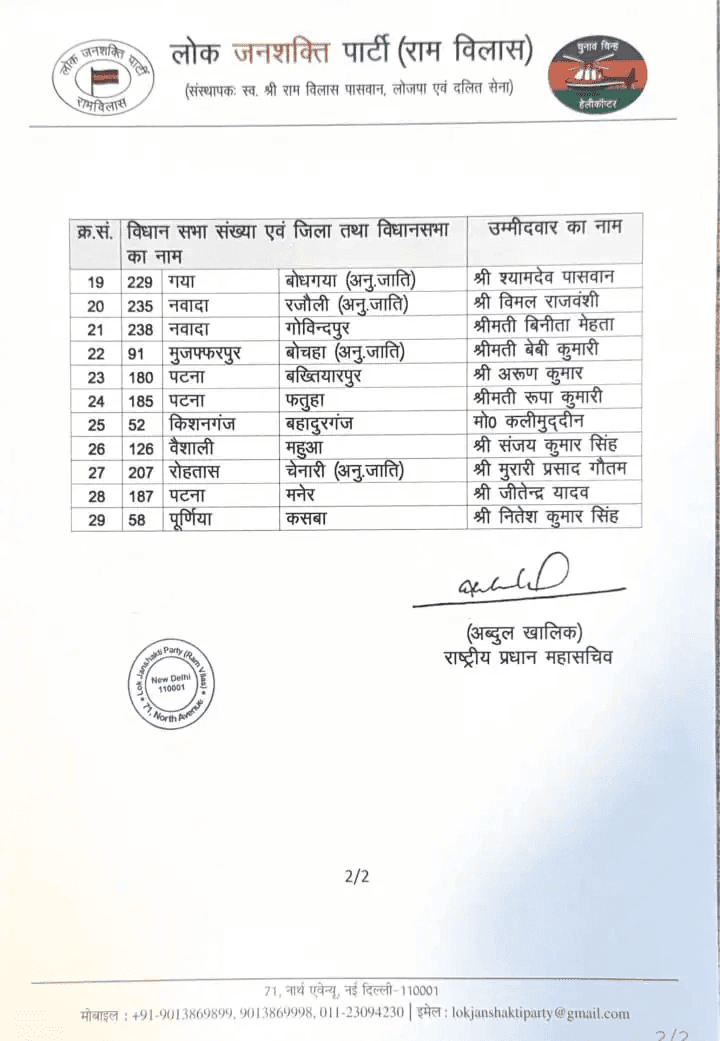 चिराग पासवान की पार्टी के उम्मीदवारों की लिस्ट
