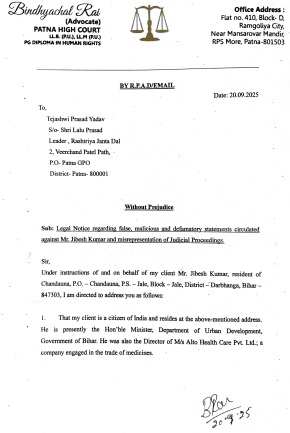 नोटिस में विशेष रूप से 15 और 16 सितंबर 2025 को तेजस्वी यादव द्वारा फेसबुक पर की गई पोस्ट का जिक्र है. इन पोस्टों में तेजस्वी यादव ने कथित तौर पर जीवेश कुमार को नकली दवा बेचने वाला और दवा चोरी में सजायाफ्ता मंत्री कहा था.