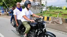 बुलेट पर राहुल गांधी और पीछे बैठे प्रदेश अध्यक्ष राजेश राम