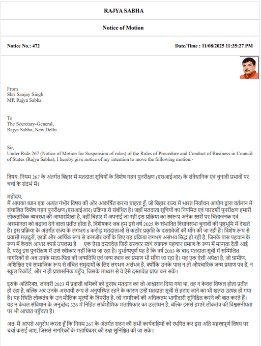 संजय सिंह ने बिहार में SIR के संवैधानिक और चुनावी प्रभाव पर राज्यसभा में चर्चा के लिए दिया नोटिस