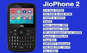 यह क्वर्टी कीपैड के साथ आयेगा. इसमें जियो के एेप के अलावा फेसबुक, व्हॉट्सएप, यू-ट्यूब, गूगल मैप जैसे एेप भी मौजूद होंगे. रिलायंस ने जियो फोन के पहले संस्करण में 1,500 रुपये वापस करने की पेशकश की थी हालांकि, जियो फोन 2 खरीदने वाले ग्राहकों को पूरा भुगतान करना होगा.