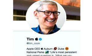 वॉशिंगटन : एपल के मुख्य कार्यकारी अधिकारी (सीईओ) टिम कुक ने ट्विटर पर अपना नाम बदल दिया है. उन्होंने अपने नाम के अंतिम शब्द ‘कुक’ की जगह एपल का इमोजी लगाया है. यह एपल का लोगो है.