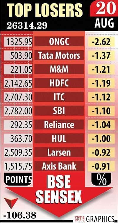 घरेलू शेयर बाजारों में सेंसेक्स के 30 शेयरों में 19 नुकसान में तथा 11 लाभ में रहे. नुकसान में रहने वाले शेयरों में ओएनजीसी (2.62 प्रतिशत), टाटा मोटर्स (1.37 प्रतिशत), महिंद्रा एंड महिंद्रा (1.21 प्रतिशत), एचडीएफसी (1.19 प्रतिशत), आईटीसी (1.12 प्रतिशत), भारतीय स्टेट बैंक (1.10 प्रतिशत), रिलायंस इंडस्टरीज (1.04 प्रतिशत) तथा एचयूएल (1.00 प्रतिशत) शामिल हैं. इसके अलावा एक्सिस बैंक तथा भारती एयरेटल में भी गिरावट दर्ज की गयी.