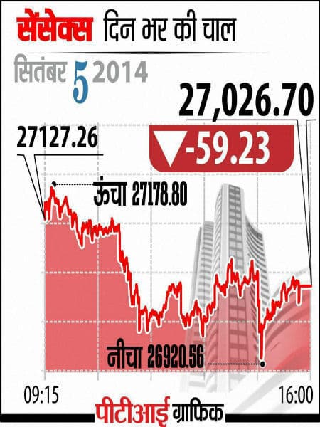 एचडीएफसी, आईसीआईसीआई बैंक, हीरो मोटोकार्प, टाटा मोटर्स, भारती एयरटेल, कोल इंडिया, भेल व टाटा पावर जैसी कंपनियों के शेयरों में गिरावट आई. बंबई शेयर बाजार का 30 शेयरों वाला सेंसेक्स बेहतर रुख में खुलने के बाद दिन के उच्चस्तर 27,178.80 अंक पर पहुंच गया. हालांकि, बाद में यह एक समय गिरकर 27,000 अंक के स्तर से नीचे 26,920.56 अंक तक गिर गया था. अंत में सेंसेक्स 59.23 अंक या 0.22 प्रतिशत की गिरावट के साथ 27,026.70 अंक पर बंद हुआ. कल गुरुवार को सेंसेक्स 54.01 अंक के नुकसान में रहा था.