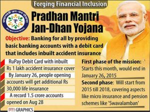 प्रधानमंत्री नरेंद्र मोदी ने 28 अगस्त को वित्तीय समावेश की यह महत्वाकांक्षी योजना पेश की थी और घोषणा की थी. इसके पहले चरण में 7.5 करोड बैंक खाते खोले जाएंगे. प्रधानमंत्री जन धन योजना में आधार से जुडे खातों के लिए 5,000 रुपये की ओवरड्राफ्ट सुविधा, रुपे डेबिट कार्ड और 1 लाख रुपये की बीमा सुरक्षा शामिल होगी. इसके अलावा इस योजना के तहत खाता धारकों को 30,000 रुपये की जीवन बीमा सुरक्षा मिलेगी.