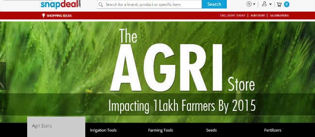 नयी दिल्ली : देश के किसानों को आसानी से कृषि सामग्री मुहैया कराने के लिए इ-रिटेलिंग कंपनी स्नैपडील डॉट कॉम ने आज ‘किसान दिवस’ के दिन ‘द एग्री स्टोर’ की शुरुआत करने की घोषणा की है.इस ऑनलाइन स्टोर से किसानों को बीज, खाद सिंचाई उपकरण अथवा अन्य सामान उपलब्ध होगा.