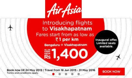 कंपनी जिस नए रूट के लिए अपनी सेवा शुरू करने वाली है, वह विशाखापत्तनम होगा. एयर एशिया ने कहा है कि गुरूवार से टिकटों की बुकिंग शुरू हो गयी है और उसका यह वर्तमान ऑफर 24 मई 2015 तक वैध रहेगा. जबकि इस ऑफर के लिए यात्रा 18 जून 2015 से 31 मई 2016 तक वैध रहेगी. एयरलाइन ने बताया कि बेंगलुरू से विशाखापट्टनम तक एयर एशिया उड़ान टिकट का मूल्य मात्र 1400 (सभी खर्च समेत) रुपए होगा.