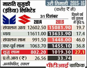 कंपनी ने पूर्व वर्ष की समान तिमाही में 802.2 करोड रुपये का शुद्ध लाभ कमाया था.मारुति सुजुकी इंडिया ने एक बयान में कहा है,‘उंची बिक्री, सामग्री लागत में कटौती की पहलों तथा अनुकूल विनिमय दर ने आलोच्य तिमाही में मुनाफे में योगदान किया. ‘ कंपनी ने कहा है कि तीसरी तिमाही में कंपनी की शुद्ध बिक्री 20.4 प्रतिशत बढकर 14,767.7 करोड रुपये हो गई. आलोच्य तिमाही में कंपनी की वाहन बिक्री 15.5 प्रतिशत बढकर 3,74,182 वाहन रही.