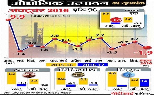 केंद्रीय सांख्यिकी कार्यालय (सीएसओ) के अनुसार चालू वित्त वर्ष की अप्रैल से अक्तूबर अवधि में औद्योगिक उत्पादन 0.3 प्रतिशत घटा है. इससे पिछले वित्त वर्ष की समान अवधि में यह 4.8 प्रतिशत बढा था. पिछले साल अक्तूबर में कारखाना उत्पादन में 9.9 प्रतिशत वृद्धि हुई थी. मुख्य रूप से विनिर्माण क्षेत्र के बेहतर प्रदर्शन तथा पूंजीगत सामान का उत्पादन 16.5 प्रतिशत बढने की वजह से उस समय औद्योगिक उत्पादन बढ़ा था.
