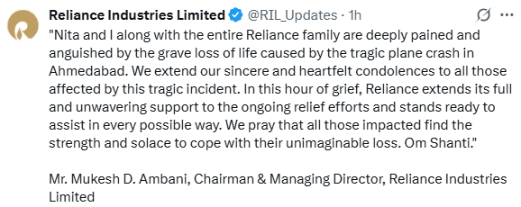 मुकेश अंबानी और नीता अंबानी ने संयुक्त रूप से एक शोक संदेश जारी करते हुए कहा, “नीता और मैं, साथ ही पूरी रिलायंस फैमिली, इस दिल दहला देने वाली दुर्घटना से बेहद दुखी और व्यथित हैं. हम इस दुख की घड़ी में उन सभी लोगों के प्रति अपनी गहरी संवेदना प्रकट करते हैं जिन्होंने अपनों को खोया है.” उन्होंने आगे कहा कि रिलायंस इंडस्ट्रीज इस संकट के समय पीड़ितों और उनके परिजनों के साथ पूरी मजबूती से खड़ी है और राहत कार्यों में हर संभव सहायता देने के लिए तैयार है.