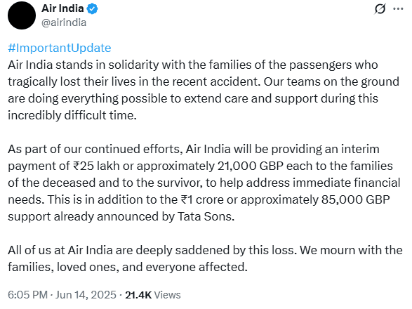 एयर इंडिया की ओर से बयान में कहा गया, “हम मृतकों के परिजनों और एकमात्र जीवित यात्री को ₹25 लाख की अंतरिम सहायता राशि दे रहे हैं.” इसके साथ ही हादसे में घायल हुए लोगों, जिनमें बी.जे. मेडिकल कॉलेज के छात्र भी शामिल हैं, उनका संपूर्ण इलाज खर्च एयर इंडिया उठाएगी.