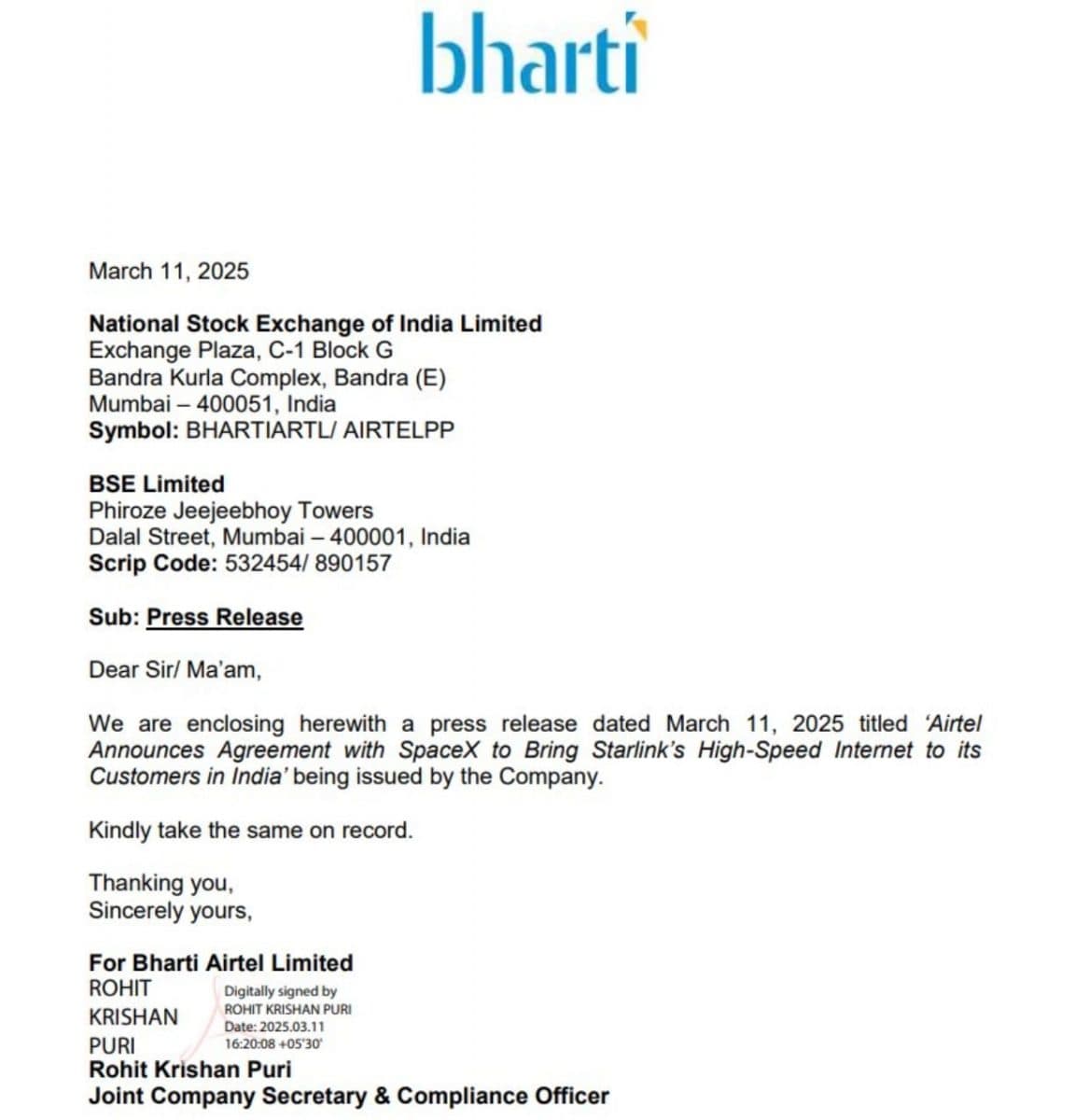 भारती एयरटेल लिमिटेड के प्रबंध निदेशक और उपाध्यक्ष गोपाल विट्टल ने कहा, “एयरटेल ग्राहकों के लिए स्टारलिंक सेवाएं उपलब्ध कराने के लिए स्पेसएक्स के साथ साझेदारी करना एक महत्वपूर्ण कदम है. यह अगली पीढ़ी की सैटेलाइट कनेक्टिविटी के प्रति हमारी प्रतिबद्धता को दर्शाता है.”