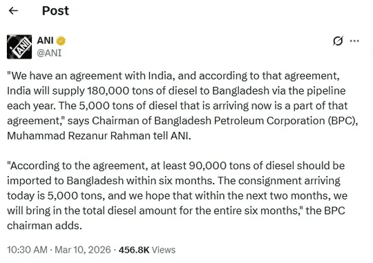 इसी संकट के बीच, मंगलवार (10 मार्च 2026) को भारत ने इंडिया-बांग्लादेश फ्रेंडशिप पाइपलाइन (IBFP) के जरिए 5,000 टन डीजल बांग्लादेश भेजा. सोशल मीडिया पर इसे लेकर बहस छिड़ी है, लेकिन इसके पीछे ठोस द्विपक्षीय कारण हैं.