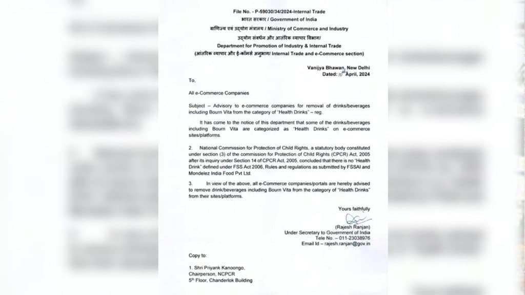 Bournvita: वाणिज्य एवं उद्योग मंत्रालय ने एक नोटिफिकेशन जारी करके सभी ई-कॉमर्स कंपनियों से कहा है कि वे अपनी वेबसाइट और प्लेटफॉर्म से बोर्नविटा सहित सभी पेय पदार्थों को 'हेल्थ ड्रिंक' की कैटेगरी से हटा दें. इसे लेकर कुछ महीने पहले, NCPCR के चीफ प्रियंक कानूनगो के द्वारा कुछ वक्त पहले वाणिज्य मंत्रालय, राज्य सरकार और केंद्र शासित प्रदेश के कंज्यूमर अफेयर डिपॉर्टमेंट और FSSAI को एक पत्र लिखा गया था.
