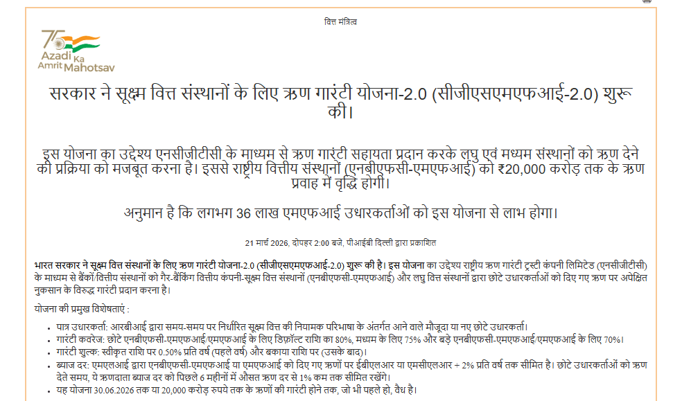 CGSMFI-2.0 Scheme: केंद्र सरकार ने माइक्रोफाइनेंस सेक्टर को नई ताकत देने के लिए ‘क्रेडिट गारंटी स्कीम 2.0’ (CGSMFI-2.0) की शुरुआत की है. इस योजना का मेन मोटिव उन लोगों तक पैसा पहुंचाना है जिन्हें बैंकिंग सिस्टम से लोन मिलने में दिक्कत होती है. सरकार इस स्कीम के जरिए लगभग 20,000 करोड़ रुपये का अतिरिक्त लोन मार्केट में घुमाना चाहती है, जिससे सीधे तौर पर 36 लाख छोटे कर्जदारों को फायदा होगा.