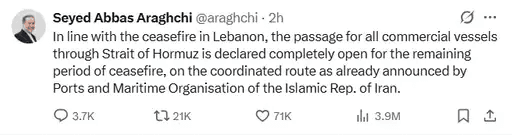 ईरान के विदेश मंत्री सैयद अब्बास अराघची ने पुष्टि की है कि इजराइल और लेबनान के बीच हुए 10 दिनों के युद्धविराम के बाद यह कदम उठाया गया है. अमेरिकी राष्ट्रपति डोनाल्ड ट्रम्प ने भी इस पर खुशी जाहिर करते हुए कहा है कि ईरान अब इस रास्ते को कभी बंद नहीं करेगा और इसे दुनिया के खिलाफ हथियार की तरह इस्तेमाल नहीं किया जाएगा.