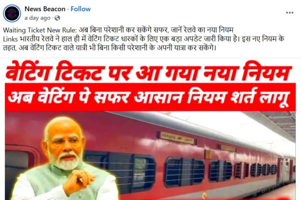फेसबुक यूजर News Beacon ने भी इससे मिलते-जुलते दावे को शेयर (आर्काइव लिंक) किया. इसमें लिखा है, ‘Waiting Ticket New Rule: अब बिना परेशानी कर सकेंगे सफर, जानें रेलवे का नया नियम Links भारतीय रेलवे ने हाल ही में वेटिंग टिकट धारकों के लिए एक बड़ा अपडेट जारी किया है. इस नए नियम के तहत, अब वेटिंग टिकट वाले यात्री भी बिना किसी परेशानी के अपनी यात्रा कर सकेंगे.’