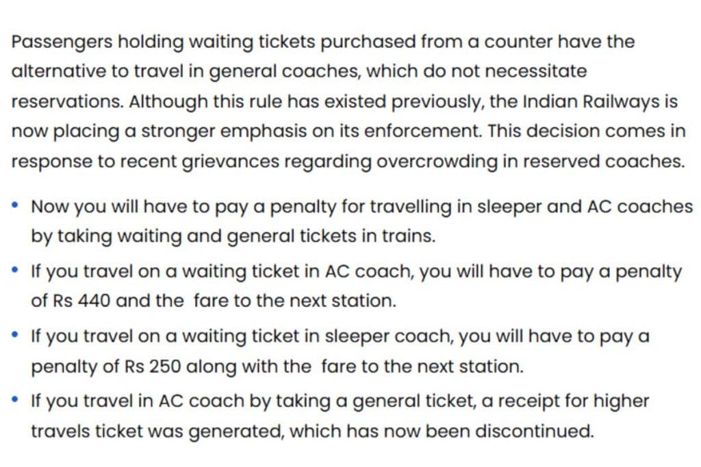इंडिया डॉट कॉम की वेबसाइट पर 16 जुलाई 2024 को छपी खबर के अनुसार, भारतीय रेलवे वेटिंग लिस्ट वाले यात्रियों के लिए कड़े नियम लागू कर दिए हैं. इसके तहत, वेटिंग टिकट पर आरक्षित कोच में यात्रा करने पर यात्री से जुर्माना लेकर अगले स्टेशन पर उतार दिया जाएगा. ऐसे यात्री को एसी कोच में सफर करने पर कम से कम 440 रुपये जुर्माना और अगले स्टेशन तक का किराया भरना पड़ेगा. स्लीपर कोच में वेटिंग टिकट पर यात्रा करने पर 250 रुपये का जुर्माना और अगले स्टेशन तक का किराया देना पड़ेगा.