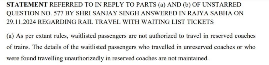 29 नवंबर 2024 को राज्यसभा में रेलवे में वेटिंग टिकट को लेकर पूछे गए सवाल पर रेल मंत्री अश्विनी वैष्णव ने कहा था कि नियमों के अनुसार, वेटिंग लिस्ट वाले यात्री रिजर्व कोच में यात्रा नहीं कर सकते हैं.