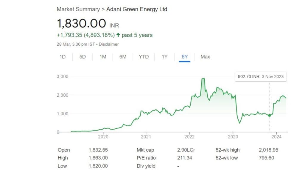अदाणी ग्रीन एनर्जी लिमिटेड का स्टॉक इस वित्त वर्ष के आखिरी कारोबारी दिन 0.41 प्रतिशत यानी 7.50 रुपये की तेजी के साथ 1,830 रुपये पर बंद हुआ था. हालांकि, पिछले एक महीने में कंपनी के स्टॉक ने निवेशकों को 3.43 प्रतिशत का निगेटिव रिटर्न दिया है. जबकि, पिछले छह महीने में निवेशकों को 87.89 प्रतिशत का जबरदस्त रिटर्न मिला है. कंपनी ने निवेशकों को सालाना आधार पर 107 प्रतिशत का रिटर्न दिया है. एक साल पहले 31 मार्च 2023 को कंपनी स्टॉक की कीमत 881.15 रुपये थी. जबकि, पिछले पांच सालों में कंपनी के स्टॉक ने निवेशकों को झोली भरकर 4,893.18 प्रतिशत का सोच से ज्यादा का रिटर्न दिया है. 05 अप्रैल 2019 को कंपनी के स्टॉक की कीमत केवल 36.65 रुपये थी.