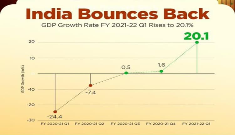 नई दिल्ली : कोरोना महामारी से त्रस्त भारत की अर्थव्यवस्था अब पटरी पर लौटने लगी है. देश के सकल घरेलू उत्पाद (जीडीपी) में वित्त वर्ष 2021-22 की पहली तिमाही में 20.1 फीसदी वृद्धि दर्ज की गई. कोरोना महामारी के इस दौर में एक साल पहले की पहली तिमाही के मुकाबले इस साल की पहली तिमाही की जीडीपी ग्रोथ रेट काफी ऊंची रही है.