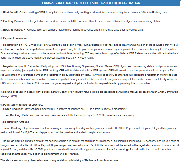 रजिस्ट्रेशन चार्ज की बात करें तो, कोच बुकिंग के लिए 1 कोच पर ₹50,000 जमा करना होता है (7 दिनों तक की यात्रा के लिए). अगर यात्रा 7 दिन से अधिक है तो प्रति कोच ₹10,000/- प्रति अतिरिक्त दिन जोड़ा जाएगा. ट्रेन बुकिंग के लिए कम से कम 18 कोच का शुल्क लागू होता है, चाहे आप उससे कम कोच क्यों न लें.