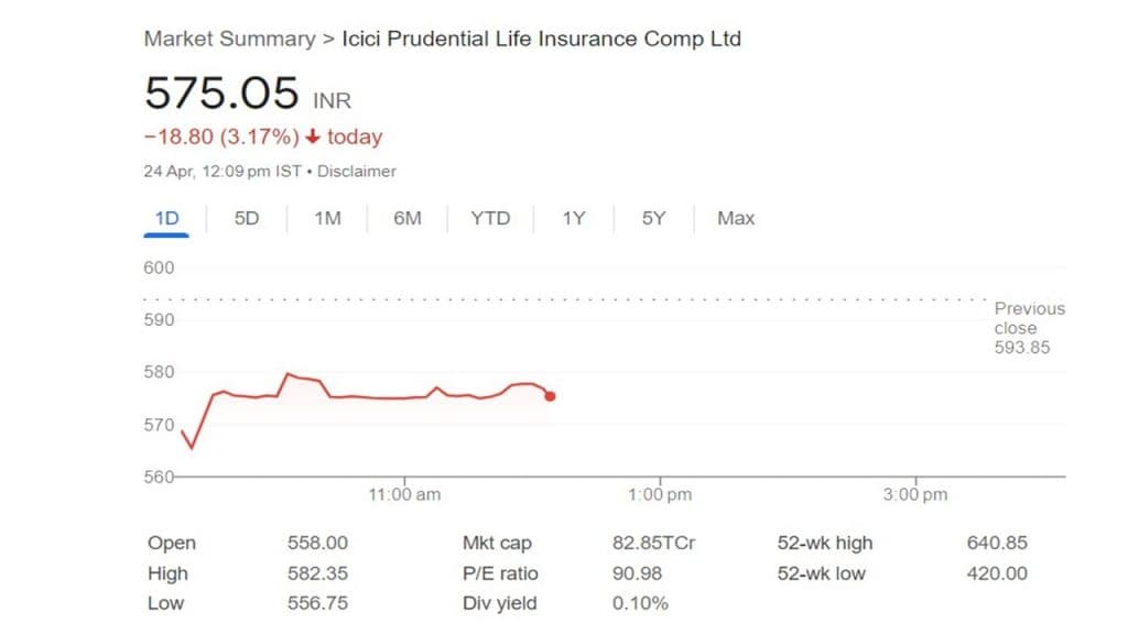 कंपनी का शेयर दोपहर 12.15 बजे 3.17 प्रतिशत यानी 18.80 रुपये टूटकर 575.05 रुपये पर कारोबार कर रहा है. आज कारोबार के दौरान ये 556.75 रुपये तक टूटा है. आईसीआईसीआई प्रूडेंशियल के स्टॉक ने पिछले पिछले पांच कारोबारी दिनों में 5.61 प्रतिशत का निगेटिव रिटर्न दिया है. जबकि, छहमाही आधार पर कंपनी ने 10.91 प्रतिशत का रिटर्न दिया है. वहीं सालाना आधार पर निवेशकों को 29.91 प्रतिशत का रिटर्न प्राप्त हुआ है.