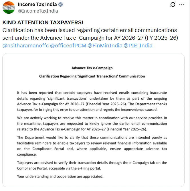 इनकम टैक्स विभाग ने सोशल मीडिया प्लेटफॉर्म X पर पोस्ट करके बताया कि एडवांस टैक्स ई-कैंपेन के तहत भेजे गए कुछ ईमेल में तकनीकी गलती हो गई थी. विभाग ने टैक्सपेयर्स से कहा कि अभी उन ईमेल को नजरअंदाज कर दें. साथ ही यह भी बताया कि समस्या को ठीक करने के लिए सर्विस प्रोवाइडर के साथ मिलकर काम किया जा रहा है. विभाग ने इस असुविधा के लिए माफी भी मांगी.