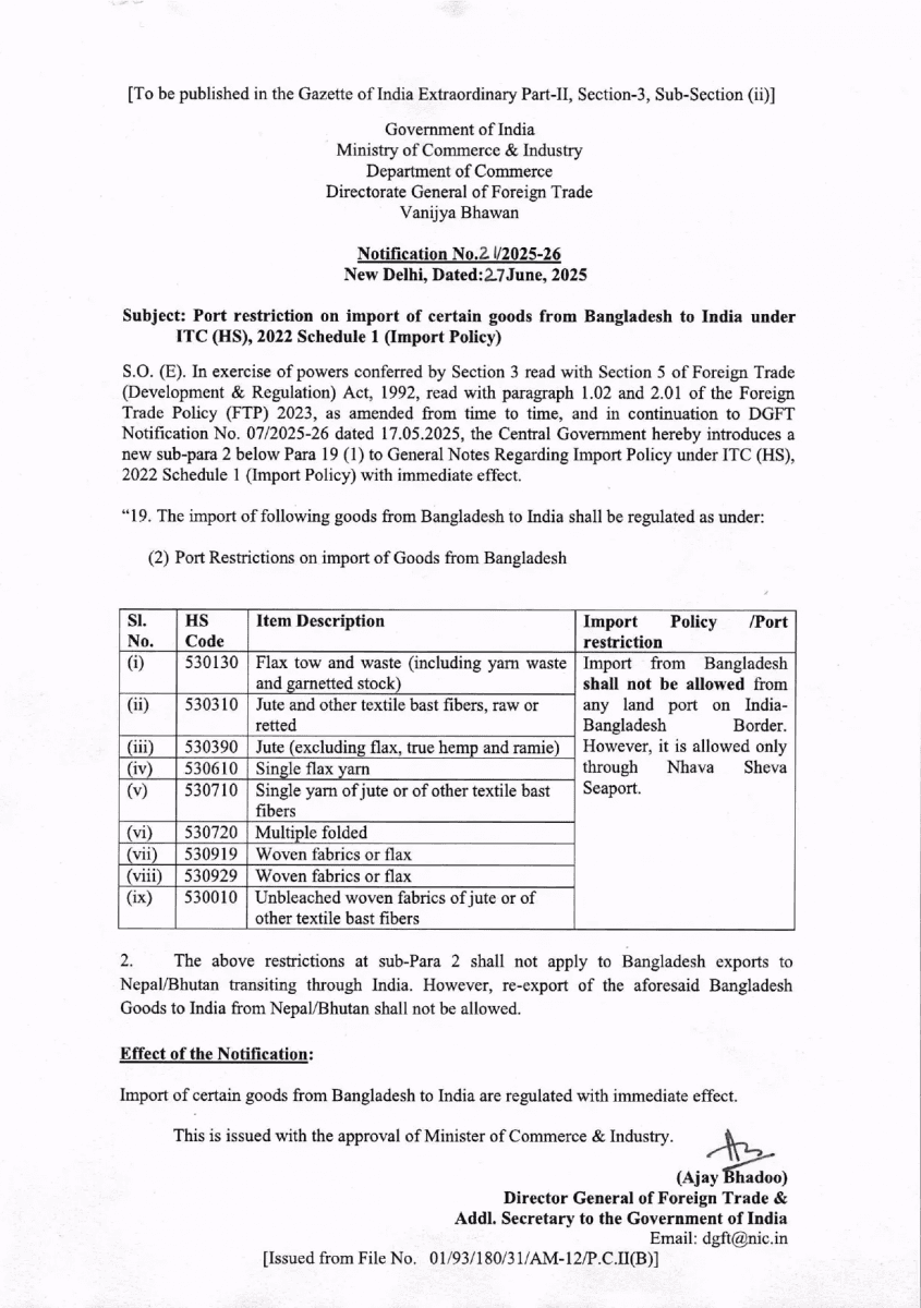 India jute import ban: बांग्लादेश से भारत में आने वाले जूट और उसके कई उत्पादों पर अब बंदिशें लग गई हैं. भारत सरकार ने एक बड़ा फैसला लेते हुए कहा है कि अब इन उत्पादों का आयात केवल मुंबई के न्हावा शेवा बंदरगाह से ही होगा. जमीनी सीमा चौकियों से ये आयात पूरी तरह प्रतिबंधित कर दिया गया है.