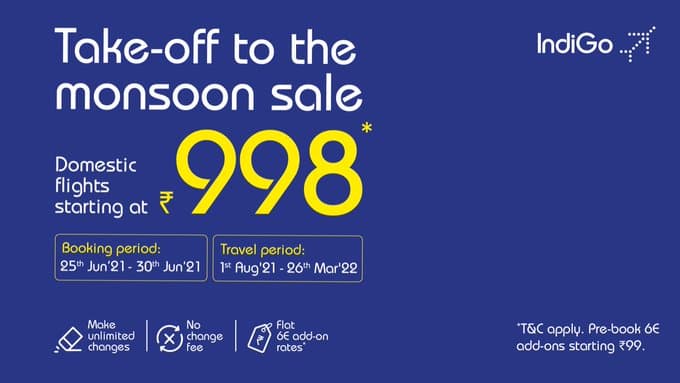 क्या आप इंडिगो के मानसून ऑफर का लाभ उठाना चाहते हैं? अगर हां तो तैयार हो जायें कंपनी आपको मात्र 998 रुपये में हवाई यात्रा करवायेगी. कंपनी ने अपने इस ऑफर की जानकारी ट्वीट करके दी है.