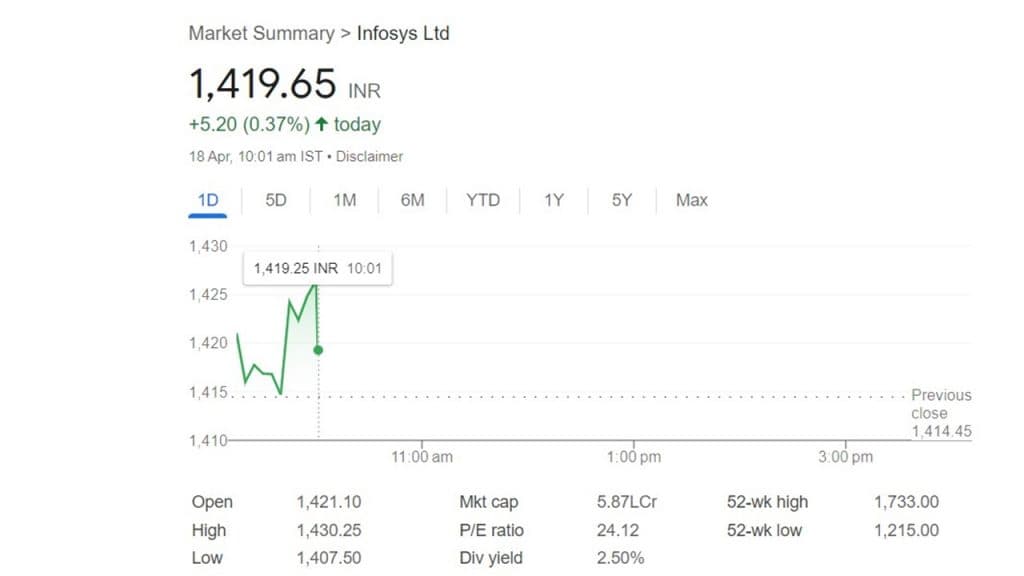 Infosys Q4 Result: भारतीय शेयर बाजार में तीन दिनों के बाद, आज तेजी का रुख देखने को मिल रहा है. हालांकि, निफ्टी पर आईटी सेक्टर में 37 अंकों की मामूली गिरावट देखने को मिल रही है. इस बीच, आज दिग्गज टेक कंपनी इंफोसिस के स्टॉक में सुबह 10 बजे एक प्रतिशत की तेजी देखने को मिल रही है. कंपनी का शेयर का भाव 0.37 प्रतिशत यानी 5.20 अंकों की तेजी के साथ 1419.65 रुपये पर कारोबार कर रहा है. जबकि, इंट्रा ट्रेड के दौरान ये 1430 रुपये के भाव पर पहुंच गया था. बताया जा रहा है कि कंपनी के द्वारा शेयर मार्केट बंद होने के बाद, शाम 3.45 बजे कंपनी के नतीजे घोषित किया जाएगा. इंफोसिस नतीजों के साथ-साथ शेयरहोल्डर्स के लिए डिविडेंड का भी ऐलान कर सकती है.