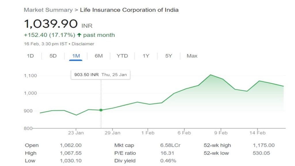 एलआईसी के आयकर विभाग के पैसे मिलने का असर शेयर बाजार में सोमवार को देखने को मिलेगा. पिछले कुछ दिनों में एलआईसी के स्टॉक में काफी तेजी देखने को मिली है. पिछले एक महीने में निगम के शेयर ने निवेशकों को करीब 17 प्रतिशत यानी 152.40 रुपये का रिटर्न दिया है. वहीं, छह महीने में निवेशकों को 57.64 प्रतिशत यानी 380.25 रुपये प्रति शेयर का फायदा मिला है. पिछले एक साल में एलआईसी के निवेशकों की संपत्ति 72.55 बढ़ी है. उन्हें प्रति शेयर पर 437.25 रुपये का मुनाफा हुआ है. हालांकि, पिछले पांच कारोबारी दिनों में कंपनी के शेयर में करीब 7.55 प्रतिशत की गिरावट देखने को मिली है. सप्ताह के आखिरी कारोबारी दिन भारतीय जीवन बीमा निगम का स्टॉक 1.53 प्रतिशत यानी 16.20 रुपये टूटकर 1,039.90 पर बंद हुआ.