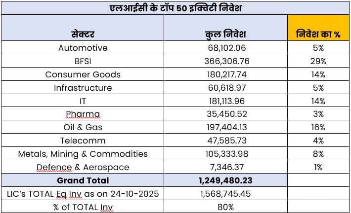 एलआईसी के शेयर निवेश का करीब 80% हिस्सा उसकी टॉप 50 कंपनियों में लगा हुआ है. इन कंपनियों में निवेश का विश्लेषण एक महत्वपूर्ण ट्रेंड दिखाता है. इसका करीब 29% निवेश बीएफएसआई सेक्टर में है. बीएफएसआई यानी बैंकिंग, फाइनेंस, सर्विस और इंश्योरेंस एलआईसी का सबसे बड़ा और सबसे भरोसेमंद निवेश क्षेत्र माना जाता है. इस क्षेत्र में स्थिरता, उच्च नकदी प्रवाह और मजबूत बैलेंस शीट एलआईसी को आकर्षित करती है.