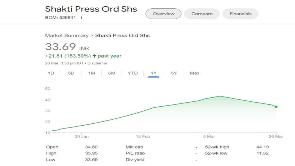 शक्ति प्रेस के स्टॉक में कल गिरावट देखने को मिली. कंपनी के शेयर 4.99 प्रतिशत यानी 1.77 रुपये गिरकर 33.69 रुपये पर बंद हुए. जबकि, पिछले छह महीने में कंपनी ने निवेशकों को 183.59 प्रतिशत का जबरदस्त रिटर्न दिया है. वहीं, सालाना आधार पर भी 183 प्रतिशत का ही रिटर्न है. समझा जा रहा है कि आने वाले सालों में कंपनी निवेशकों को और बेहतर रिटर्न दे सकती है.
