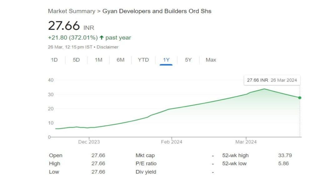 ज्ञान डेवलपर्स एंड बिल्डर ने पिछले छह महीने में निवेशकों को बंपर रिटर्न दिया है. कंपनी के निवेशकों ने इससे केवल छह महीने में ही 309.78 प्रतिशत का मुनाफा कमाया है. जबकि, सालाना आधार पर कंपनी ने 372 प्रतिशत का रिटर्न दिया है. एक साल पहले 27 मार्च को कंपनी के स्टॉक की कीमत 5.86 रुपये थी. हालांकि, पिछले पांच सालों में कंपनी के स्टॉक से निवेशकों की 346.85 प्रतिशत की कमाई हुई है.
