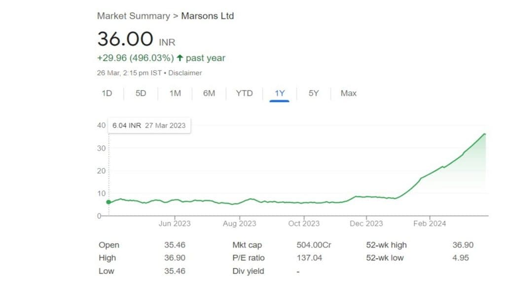 मार्सन्स लिमिटेड के स्टॉक ने पिछले पांच दिनों में 5.54 प्रतिशत यानी 1.89 रुपये रिटर्न निवेशकों को दिया है. वहीं, कंपनी के स्टॉक ने एक महीने में 41.62 प्रतिशत का बंपर रिटर्न दिया है. जबकि, छह माही आधार पर 542.86 प्रतिशत और सालाना आधार पर 496.03 प्रतिशत का रिटर्न निवेशकों को प्राप्त हुआ है. 36 रुपये वाले इस स्टॉक की कीमत 27 मार्च 2023 को 6.04 रुपये थी.